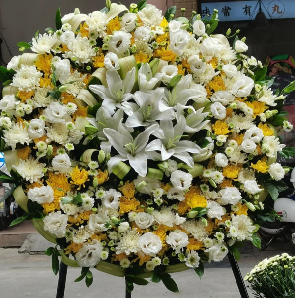 | 花圈和祭幛上的挽联分上下两条,右边为上联,左边为下联(免费撰写花圈挽联)。 上联常用“悼念XXX”、“沉痛悼念XXX”、或“某某某千古”; 下联常用“XXX敬挽”、“XXX泣挽”、“XXX拜挽”; (上)称呼XXX先生千古 (下)辈分XXX、XXX敬挽  | |
