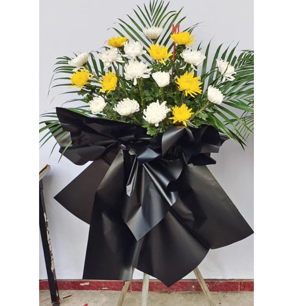 | 花圈和祭幛上的挽联分上下两条,右边为上联,左边为下联(免费撰写花圈挽联)。 上联常用“悼念XXX”、“沉痛悼念XXX”、或“某某某千古”; 下联常用“XXX敬挽”、“XXX泣挽”、“XXX拜挽”; (上)称呼XXX先生千古 (下)辈分XXX、XXX敬挽 ![]() | |