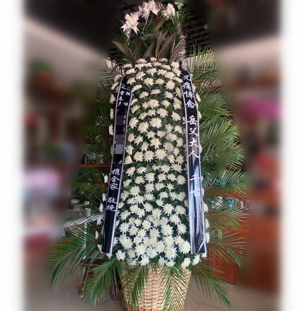 | 花圈和祭幛上的挽联分上下两条,右边为上联,左边为下联(免费撰写花圈挽联)。 上联常用“悼念XXX”、“沉痛悼念XXX”、或“某某某千古”; 下联常用“XXX敬挽”、“XXX泣挽”、“XXX拜挽”; (上)称呼XXX先生千古 (下)辈分XXX、XXX敬挽  | |