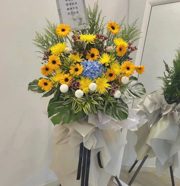 | 花圈和祭幛上的挽联分上下两条,右边为上联,左边为下联(免费撰写花圈挽联)。 上联常用“悼念XXX”、“沉痛悼念XXX”、或“某某某千古”; 下联常用“XXX敬挽”、“XXX泣挽”、“XXX拜挽”; (上)称呼XXX先生千古 (下)辈分XXX、XXX敬挽  | |