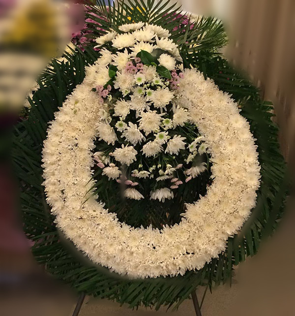 | 花圈和祭幛上的挽联分上下两条,右边为上联,左边为下联(免费撰写花圈挽联)。 上联常用“悼念XXX”、“沉痛悼念XXX”、或“某某某千古”; 下联常用“XXX敬挽”、“XXX泣挽”、“XXX拜挽”; (上)称呼XXX先生千古 (下)辈分XXX、XXX敬挽  | |