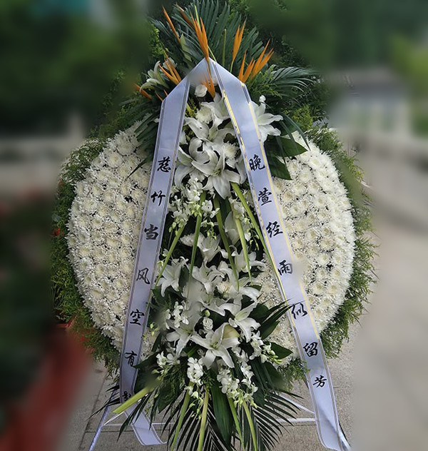 | 花圈和祭幛上的挽联分上下两条,右边为上联,左边为下联(免费撰写花圈挽联)。 上联常用“悼念XXX”、“沉痛悼念XXX”、或“某某某千古”; 下联常用“XXX敬挽”、“XXX泣挽”、“XXX拜挽”; (上)称呼XXX先生千古 (下)辈分XXX、XXX敬挽 ![]() | |