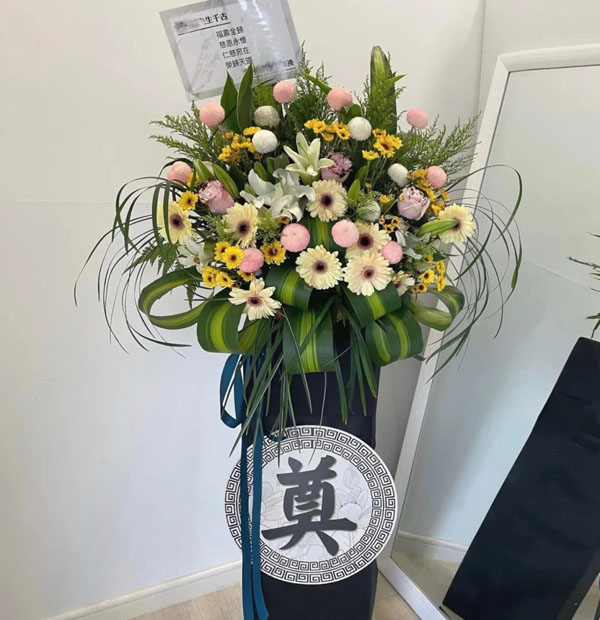 | 花圈和祭幛上的挽联分上下两条,右边为上联,左边为下联(免费撰写花圈挽联)。 上联常用“悼念XXX”、“沉痛悼念XXX”、或“某某某千古”; 下联常用“XXX敬挽”、“XXX泣挽”、“XXX拜挽”; (上)称呼XXX先生千古 (下)辈分XXX、XXX敬挽 ![]() | |