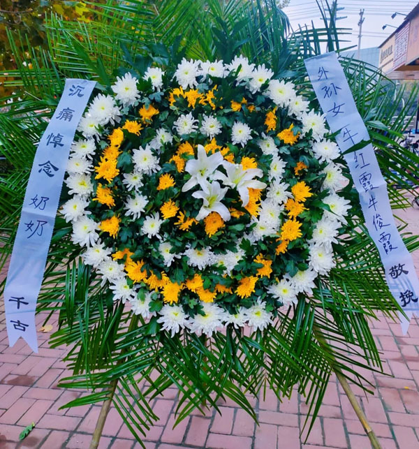 | 花圈和祭幛上的挽联分上下两条,右边为上联,左边为下联(免费撰写花圈挽联)。 上联常用“悼念XXX”、“沉痛悼念XXX”、或“某某某千古”; 下联常用“XXX敬挽”、“XXX泣挽”、“XXX拜挽”; (上)称呼XXX先生千古 (下)辈分XXX、XXX敬挽 ![]() | |