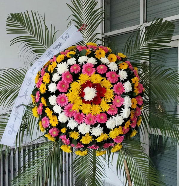 | 花圈和祭幛上的挽联分上下两条,右边为上联,左边为下联(免费撰写花圈挽联)。 上联常用“悼念XXX”、“沉痛悼念XXX”、或“某某某千古”; 下联常用“XXX敬挽”、“XXX泣挽”、“XXX拜挽”; (上)称呼XXX先生千古 (下)辈分XXX、XXX敬挽 ![]() | |