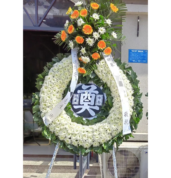 | 花圈和祭幛上的挽联分上下两条,右边为上联,左边为下联(免费撰写花圈挽联)。 上联常用“悼念XXX”、“沉痛悼念XXX”、或“某某某千古”; 下联常用“XXX敬挽”、“XXX泣挽”、“XXX拜挽”; (上)称呼XXX先生千古 (下)辈分XXX、XXX敬挽 ![]() | |