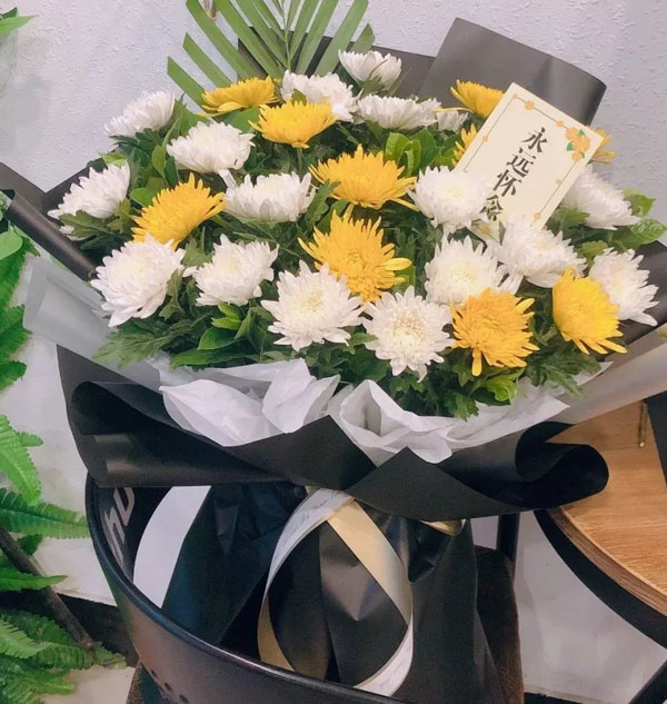 | 花圈和祭幛上的挽联分上下两条,右边为上联,左边为下联(免费撰写花圈挽联)。 上联常用“悼念XXX”、“沉痛悼念XXX”、或“某某某千古”; 下联常用“XXX敬挽”、“XXX泣挽”、“XXX拜挽”; (上)称呼XXX先生千古 (下)辈分XXX、XXX敬挽 ![]() | |