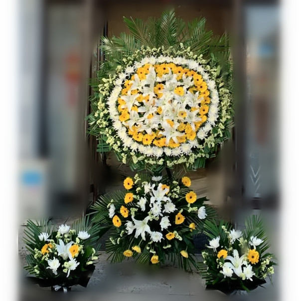 | 花圈和祭幛上的挽联分上下两条,右边为上联,左边为下联(免费撰写花圈挽联)。 上联常用“悼念XXX”、“沉痛悼念XXX”、或“某某某千古”; 下联常用“XXX敬挽”、“XXX泣挽”、“XXX拜挽”; (上)称呼XXX先生千古 (下)辈分XXX、XXX敬挽  | |