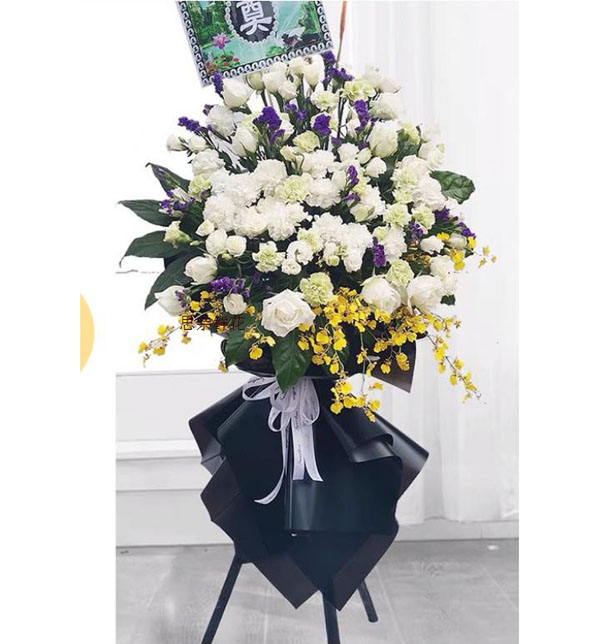 | 花圈和祭幛上的挽联分上下两条,右边为上联,左边为下联(免费撰写花圈挽联)。 上联常用“悼念XXX”、“沉痛悼念XXX”、或“某某某千古”; 下联常用“XXX敬挽”、“XXX泣挽”、“XXX拜挽”; (上)称呼XXX先生千古 (下)辈分XXX、XXX敬挽  | |