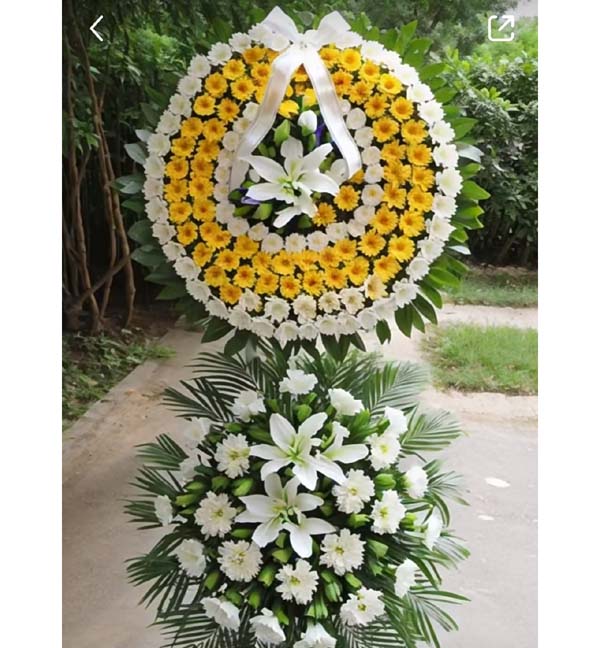 | 花圈和祭幛上的挽联分上下两条,右边为上联,左边为下联(免费撰写花圈挽联)。 上联常用“悼念XXX”、“沉痛悼念XXX”、或“某某某千古”; 下联常用“XXX敬挽”、“XXX泣挽”、“XXX拜挽”; (上)称呼XXX先生千古 (下)辈分XXX、XXX敬挽 ![]() | |