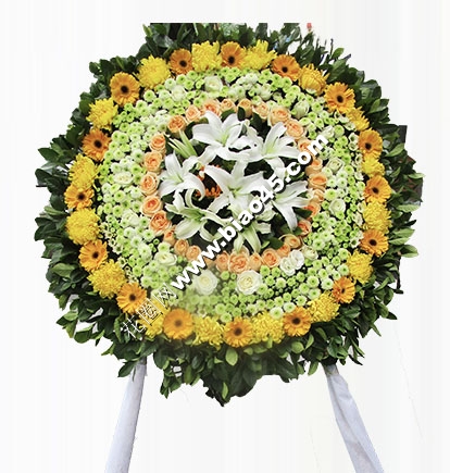 | 花圈和祭幛上的挽联分上下两条,右边为上联,左边为下联(免费撰写花圈挽联)。 上联常用“悼念XXX”、“沉痛悼念XXX”、或“某某某千古”; 下联常用“XXX敬挽”、“XXX泣挽”、“XXX拜挽”; (上)称呼XXX先生千古 (下)辈分XXX、XXX敬挽 ![]() | |
