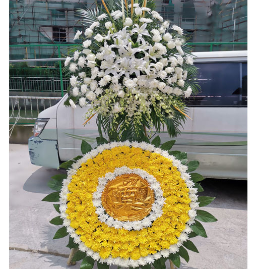 | 花圈和祭幛上的挽联分上下两条,右边为上联,左边为下联(免费撰写花圈挽联)。 上联常用“悼念XXX”、“沉痛悼念XXX”、或“某某某千古”; 下联常用“XXX敬挽”、“XXX泣挽”、“XXX拜挽”; (上)称呼XXX先生千古 (下)辈分XXX、XXX敬挽 ![]() | |