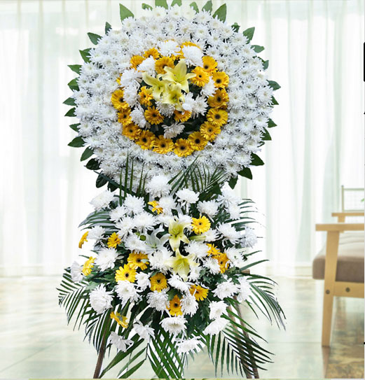 | 花圈和祭幛上的挽联分上下两条,右边为上联,左边为下联(免费撰写花圈挽联)。 上联常用“悼念XXX”、“沉痛悼念XXX”、或“某某某千古”; 下联常用“XXX敬挽”、“XXX泣挽”、“XXX拜挽”; (上)称呼XXX先生千古 (下)辈分XXX、XXX敬挽 ![]() | |