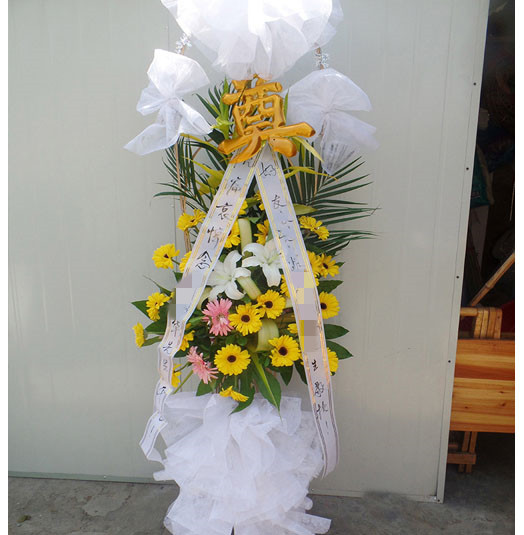 | 花圈和祭幛上的挽联分上下两条,右边为上联,左边为下联(免费撰写花圈挽联)。 上联常用“悼念XXX”、“沉痛悼念XXX”、或“某某某千古”; 下联常用“XXX敬挽”、“XXX泣挽”、“XXX拜挽”; (上)称呼XXX先生千古 (下)辈分XXX、XXX敬挽 ![]() | |