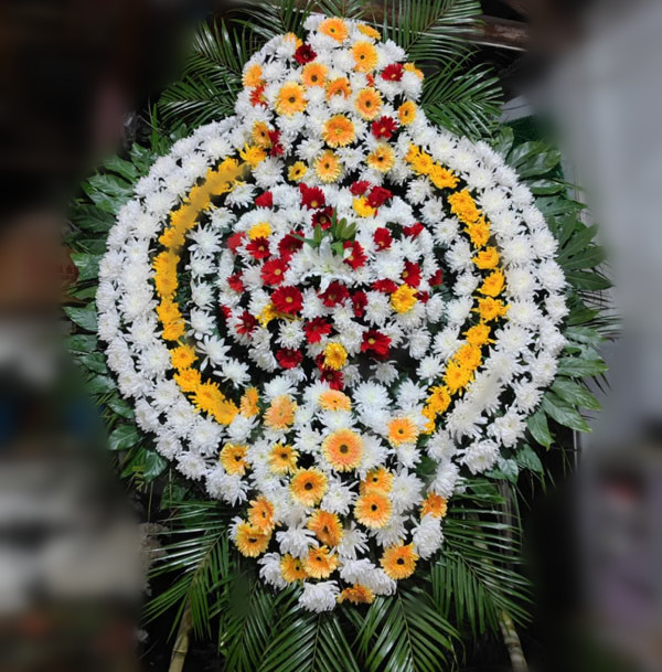 | 花圈和祭幛上的挽联分上下两条,右边为上联,左边为下联(免费撰写花圈挽联)。 上联常用“悼念XXX”、“沉痛悼念XXX”、或“某某某千古”; 下联常用“XXX敬挽”、“XXX泣挽”、“XXX拜挽”; (上)称呼XXX先生千古 (下)辈分XXX、XXX敬挽 ![]() | |