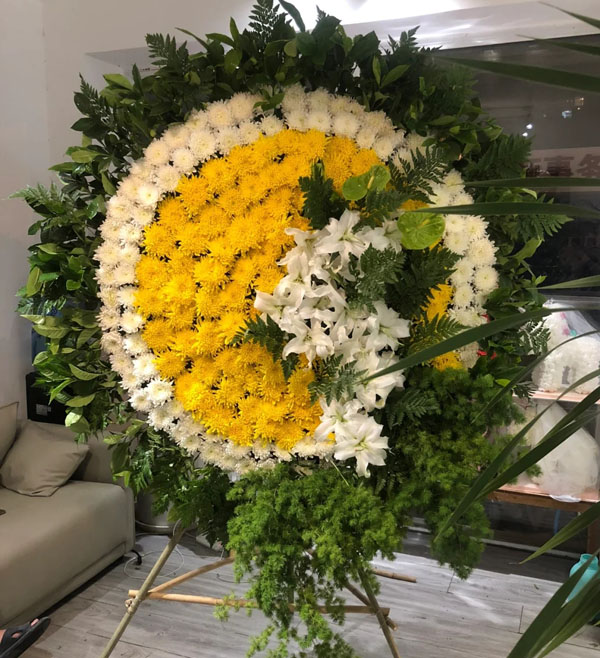 | 花圈和祭幛上的挽联分上下两条,右边为上联,左边为下联(免费撰写花圈挽联)。 上联常用“悼念XXX”、“沉痛悼念XXX”、或“某某某千古”; 下联常用“XXX敬挽”、“XXX泣挽”、“XXX拜挽”; (上)称呼XXX先生千古 (下)辈分XXX、XXX敬挽 ![]() | |