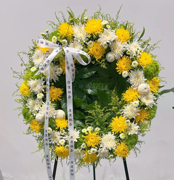 | 花圈和祭幛上的挽联分上下两条,右边为上联,左边为下联(免费撰写花圈挽联)。 上联常用“悼念XXX”、“沉痛悼念XXX”、或“某某某千古”; 下联常用“XXX敬挽”、“XXX泣挽”、“XXX拜挽”; (上)称呼XXX先生千古 (下)辈分XXX、XXX敬挽 ![]() | |
