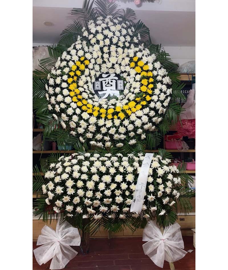 | 花圈和祭幛上的挽联分上下两条,右边为上联,左边为下联(免费撰写花圈挽联)。 上联常用“悼念XXX”、“沉痛悼念XXX”、或“某某某千古”; 下联常用“XXX敬挽”、“XXX泣挽”、“XXX拜挽”; (上)称呼XXX先生千古 (下)辈分XXX、XXX敬挽 ![]() | |